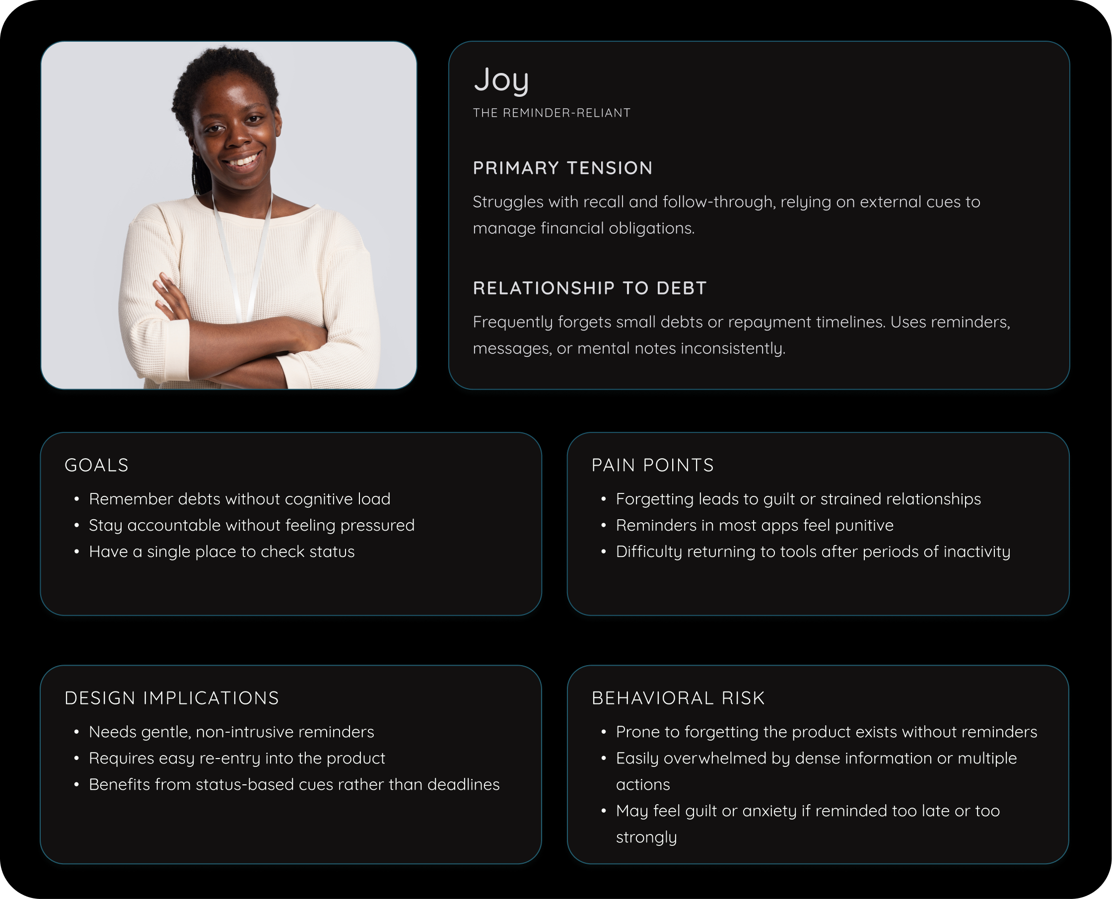 The design opportunity was to make debt visible, approachable, and human-centered: a system that supports communication, reduces tension, and fosters long-term awareness, rather than forcing immediate repayment or judgment.
