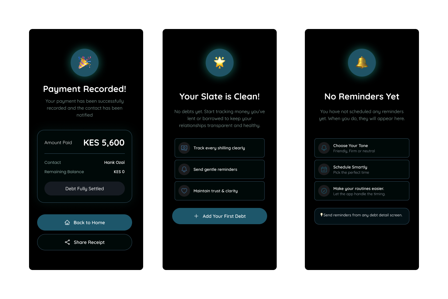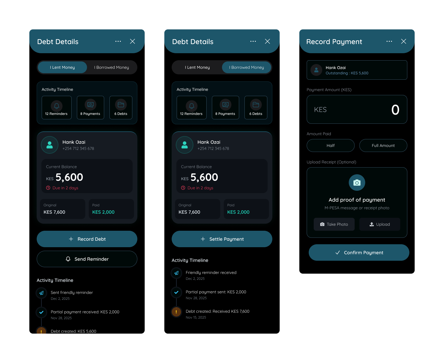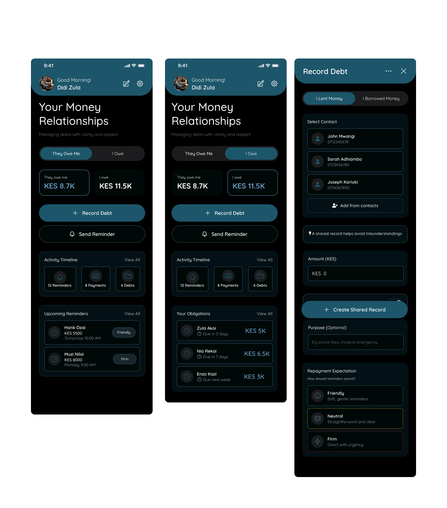 Most financial tools focus on repayment and urgency, ignoring these human dimensions. This created an opportunity to design a platform that supports clarity, trust, and long-term awareness, while respecting the relational and emotional context of debt.
